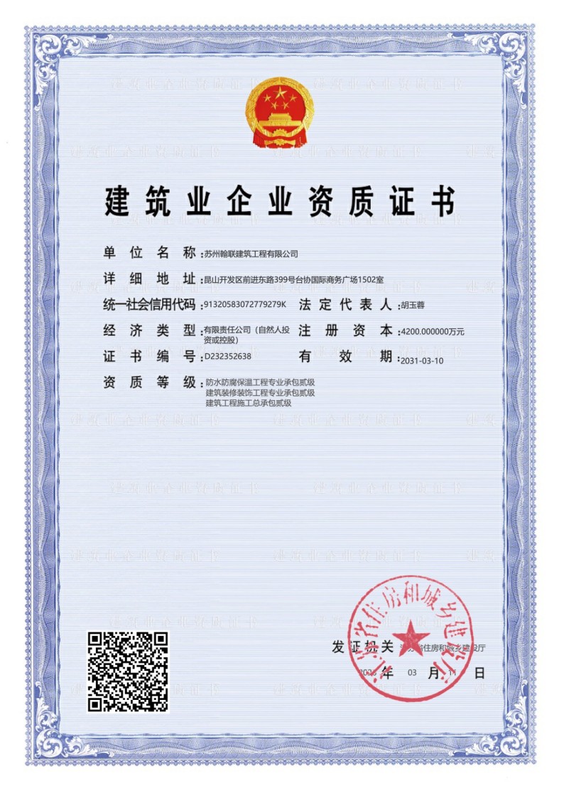 苏州翰联建筑工程有限公司成立于2013年,是一家设备多样、技术过硬、诚信经营的工程承包服务商,公司具有房建总承包贰级资质、防水防腐保温工程专业承包贰级资质、劳务分包资质、建筑装修装饰工程专业承包贰级资质、具备施工总承包能力,承建项目众多,拥有良好的资质保障与服务标准。2019年,公司与专业防水系统服务商“东方雨虹建筑修缮技术有限公司”达成战略合作,成立东方雨虹建筑修缮(昆山)服务中心,凭借核心特种功能防水材料、国家重点实验室、国家认定企业技术中心、院士专家工作站、博士后科研工作站及优秀的研发技术,形成多套完善的建筑修缮防护体系,为各类建筑提供专业化、规范化、高品质的修缮、翻新、加固等服务。